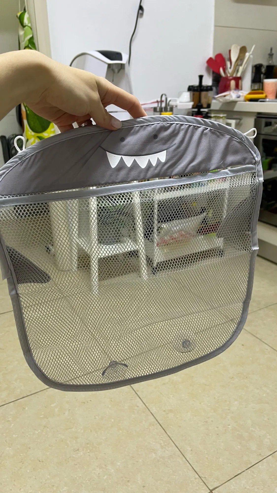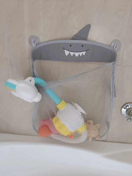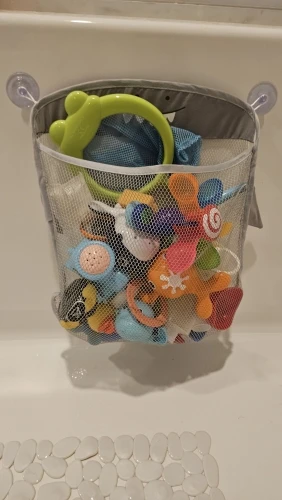 Waterproof mesh bath toy storage bag with suction cups. Keeps toys organized, allows water to drain. Prevents mould. Easy to install on bathroom walls. Convenient and hygienic.